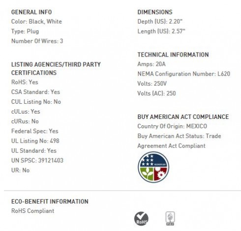 20 AMP NEMA PLUG L620 - BLACK BACK, WHITE FRONT BODY