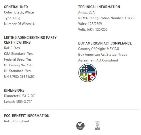 20 AMP NEMA PLUG L1420 - BLACK BACK, WHITE FRONT BODY