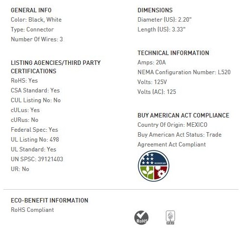 20 AMP NEMA L520 CONNECTOR - BLACK BACK, WHITE FRONT BODY