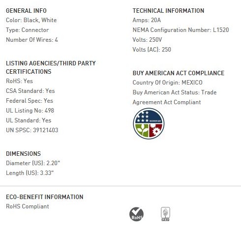 20 AMP NEMA L1520 CONNECTOR - BLACK BACK, WHITE FRONT BODY