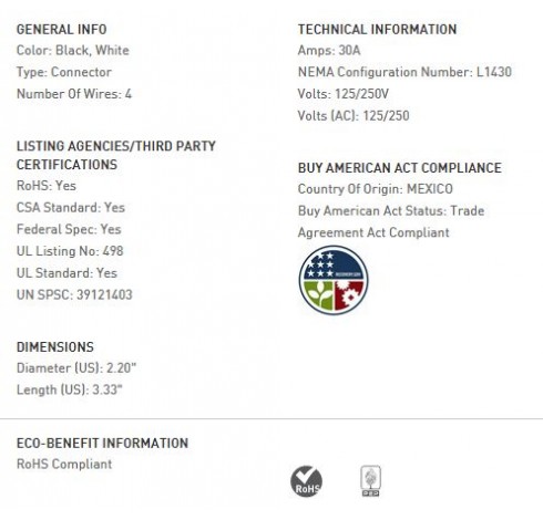 30 AMP NEMA L1430 CONNECTOR - BLACK BACK, WHITE FRONT BODY
