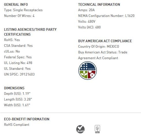 20 AMP NEMA L1620 SINGLE RECEPTACLE