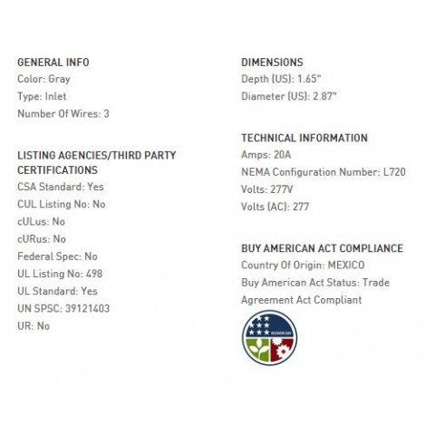 20 AMP L720 FLANGED INLET, GRAY