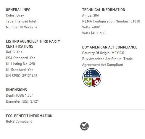 30 AMP L1630 FLANGED INLET, GRAY