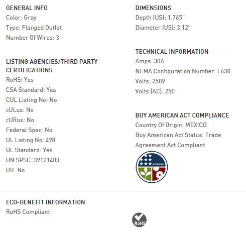 30 AMP L630 FLANGED OUTLET, GRAY