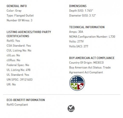 30 AMP L730 FLANGED OUTLET, GRAY